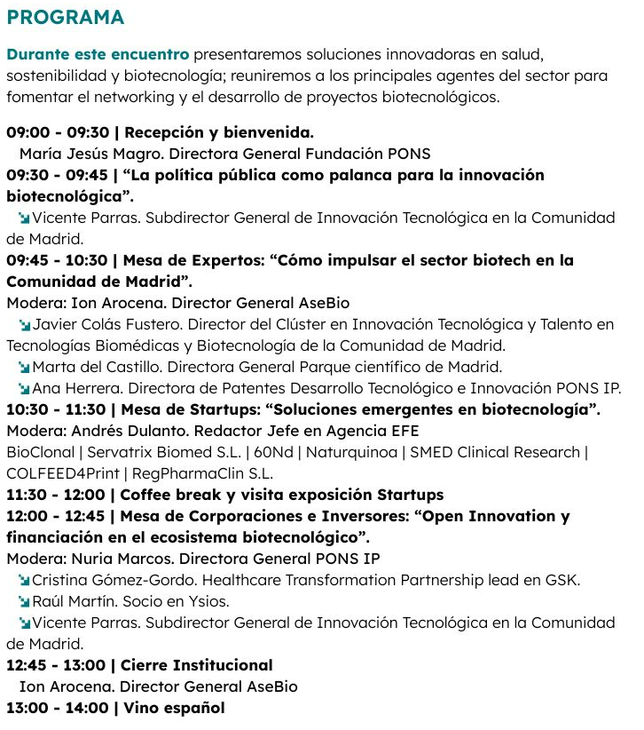 Este encuentro, que tendrá lugar en la sede de Fundación PONS, reunirá a startups nacionales del ámbito biotecnológico y será una oportunidad para visibilizar el impacto de la innovación y la tecnología en el desarrollo del sector en la Comunidad de Madrid.
