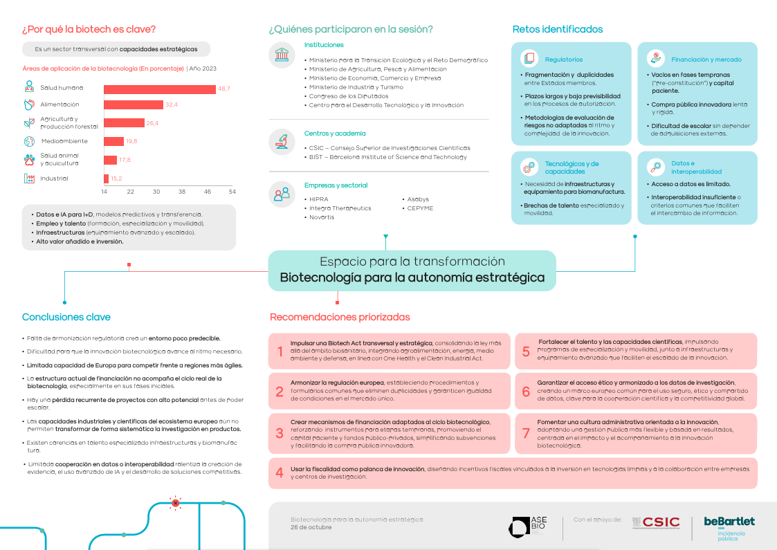 España tiene la oportunidad de consolidarse como un hub europeo de la industria biotecnológica, clave para lograr la autonomía tecnológica y científica. Con este objetivo, AseBio organizó en octubre pasado una sesión de co-creación que reunió a representantes institucionales (ministerios para la Transición Ecológica y el Reto Demográfico; Agricultura, Pesca y Alimentación; Economía, Comercio y Empresa; Industria y Turismo; Congreso de los Diputados y CDTI), empresariales y académicos del sector, con el fin de compartir conocimiento y generar propuestas que impulsen la biotecnología como motor de crecimiento y sostenibilidad. Un trabajo que tomó como base el documento elaborado por AseBio “La biotecnología: Pilar de la competitividad y la autonomía estratégica en España y Europa”.