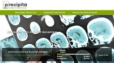 Casi un año después del lanzamiento de Precipita, más de dos mil los donantes han colaborado con los proyectos de investigación publicados en la web (ciudadanos, empresas, asociaciones, fundaciones, etc.). Sus aportaciones han superado los 220.000 euros y han ido dirigidas a 17 proyectos de investigación de áreas muy diferentes de conocimiento, desde la búsqueda de alternativas a la escasez de órganos, hasta nuevos métodos de diagnóstico para celíacos o VIH en niños menores de 18 meses.